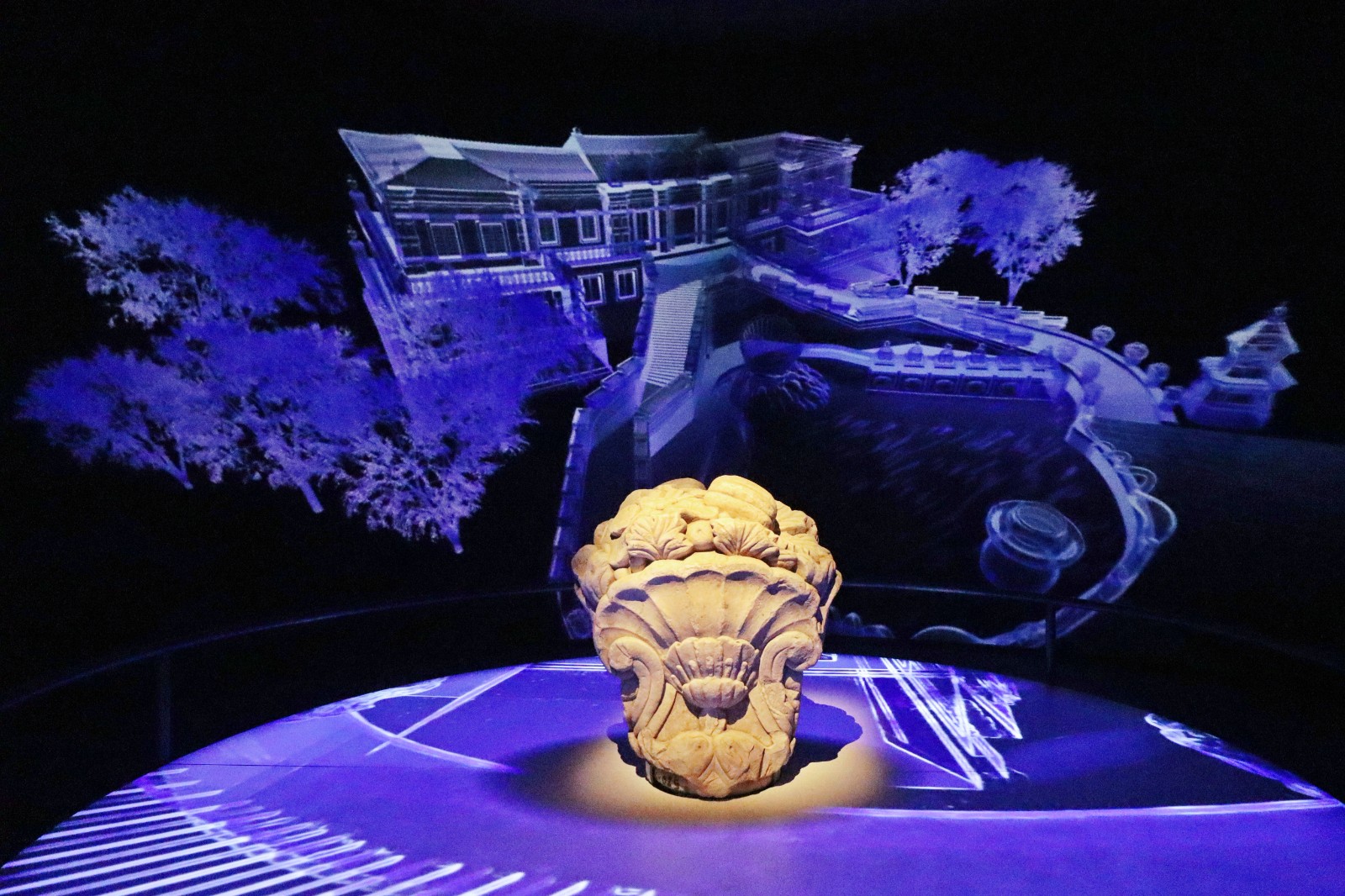 在展覽的最後部分,展示了另一件「西洋樓」的「雕花構(gòu)件」,在漢白玉的材質(zhì)頂部雕刻柿子、蓮蓬、荷葉、瓜和瓜蔓等紋飾,有瓜瓞連綿、多子多福的傳統(tǒng)吉祥寓意;側(cè)面雕刻了巴洛克風(fēng)格的貝殼、植物等西洋紋飾。紋飾雕刻受西方藝術(shù)的影響,逼真寫實,是一件中西合璧的藝術(shù)作品。從畫作《西洋樓銅板畫》中得知石構(gòu)件位於海晏堂樓上正門前左右兩邊有弧形石階,環(huán)抱著中心的大型噴泉,石階上裝飾十餘件此風(fēng)格的石構(gòu)件。梁慧淇表示,策展團隊大致確定構(gòu)件放置海晏堂西面:「在展示構(gòu)件的區(qū)域,以虛擬投影技術(shù)展示圓明園繁華到消逝的過程,希望參觀者能感受其昔日的輝煌、經(jīng)歷的劫難。」 (記者:Janice 攝影:馮瀚文)