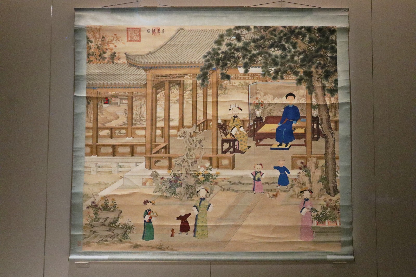 「喜溢秋庭圖」,清道光十三年至十四年(1833–1834年)。畫心上「喜溢秋庭」為道光帝親題,可見他珍愛此圖。圓明園罹難時,此圖被帶出園外,後被官兵繳獲,再由道光帝第六子、時為恭親王的奕訢送回京城。