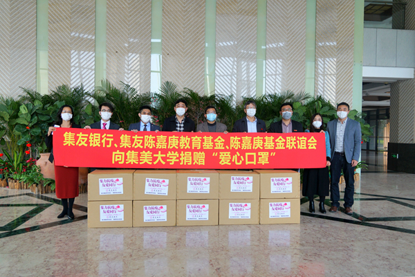 兩心望如一,萬里同一鄉(xiāng),集友銀行與同為陳嘉庚先生倡辦的集美大學有著血濃於水的手足之情,集友銀行始終秉承「以行養(yǎng)校、以行助鄉(xiāng)」的立行宗旨,從上世紀50年代起源源不斷以銀行盈利支持集美學校和福建文教公益事業(yè)的建設與發(fā)展,助力培養(yǎng)國之棟樑、讓「嘉庚精神」薪火相傳。當?shù)孟ぴ撔7酪吖ぷ髅媾R著嚴峻挑戰(zhàn)時,集友銀行立刻作出響應,四處奔波聯(lián)繫、日夜兼程轉運,聯(lián)同集友陳嘉庚教育基金、陳嘉庚基金聯(lián)誼會於3月初向集美學校師生捐贈10,000個口罩,支援集美大學撐起防疫「保護網」,為學校疫情防控工作雪中送炭,以解燃眉之急。