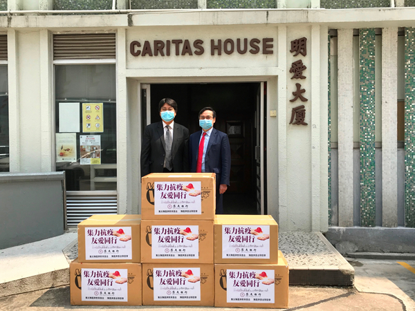 3月16日,集友銀行副總裁、陳嘉庚基金聯(lián)誼會副秘書長陳耀輝先生(右)將「愛心口罩」捐贈予香港明愛,由香港明愛財務主管全國偉先生(左)代表接受捐贈。