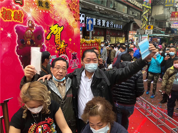 秦文荃通過(guò)深水埗鴨寮街販商協(xié)會(huì)舉辦新春派口罩活動(dòng)。