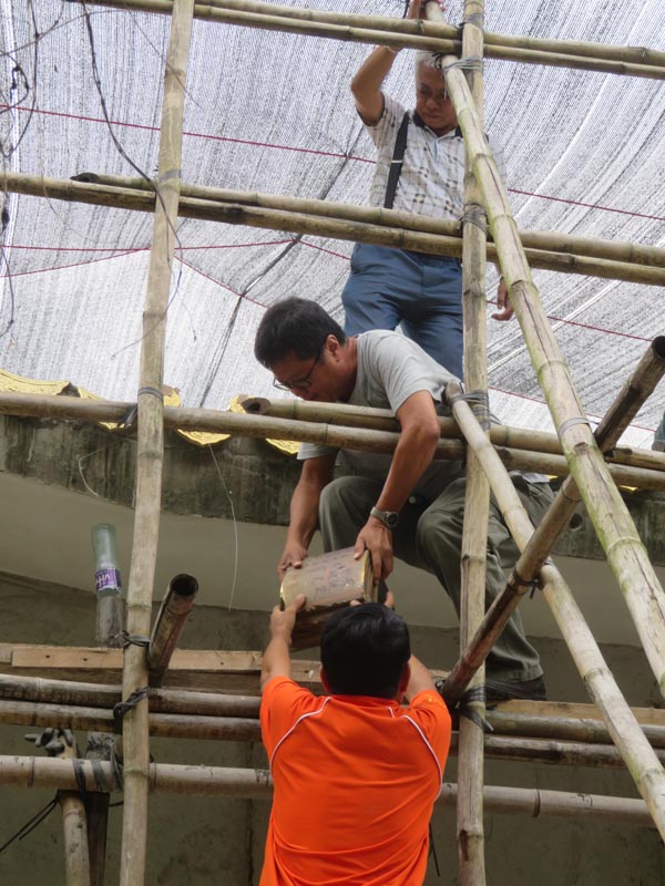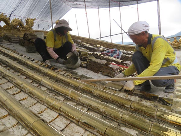 協(xié)天宮的重修工程還要進(jìn)行年多兩年才完成,現(xiàn)在頂部正鋪金瓦,工人說已鋪了個多星期,估計3周內(nèi)鋪完,共鋪6000多塊。(記者 鄭玉君)