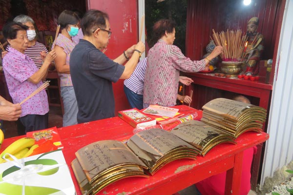 村民魚貫上香祈神恩庇佑,圖前方為寫了祝福語的鍍金瓦片。