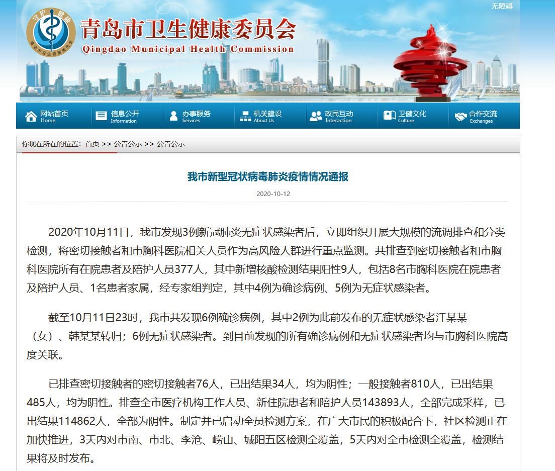 據(jù)青島市衛(wèi)健委網站消息,2020年10月11日,青島市發(fā)現(xiàn)3例新冠肺炎無癥狀感染者後,立即組織開展大規(guī)模的流調排查和分類檢測,將密切接觸者和市胸科醫(yī)院相關人員作為高風險人群進行重點監(jiān)測。共排查到密切接觸者和市胸科醫(yī)院所有在院患者及陪護人員377人,其中新增核酸檢測結果陽性9人,包括8名市胸科醫(yī)院在院患者及陪護人員、1名患者家屬,經專家組判定,其中4例為確診病例、5例為無癥狀感染者。