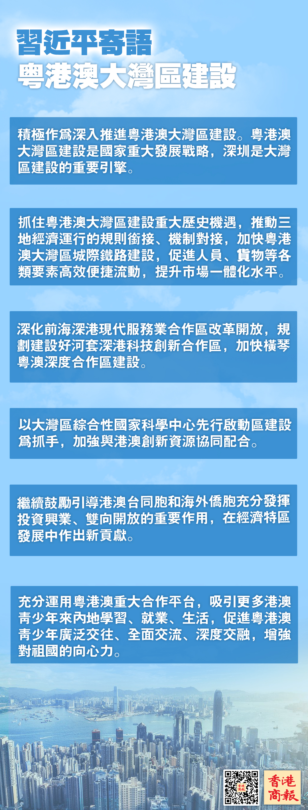 習(xí)近平說,粵港澳大灣區(qū)建設(shè)是國家重大發(fā)展戰(zhàn)略,深圳是大灣區(qū)建設(shè)的重要引擎。要抓住粵港澳大灣區(qū)建設(shè)重大歷史機遇,推動三地經(jīng)濟運行的規(guī)則銜接、機制對接,加快粵港澳大灣區(qū)城際鐵路建設(shè),促進人員、貨物等各類要素高效便捷流動,提升市場一體化水平。要深化前海深港現(xiàn)代服務(wù)業(yè)合作區(qū)改革開放,規(guī)劃建設(shè)好河套深港科技創(chuàng)新合作區(qū),加快橫琴粵澳深度合作區(qū)建設(shè)。要以大灣區(qū)綜合性國家科學(xué)中心先行啟動區(qū)建設(shè)為抓手,加強與港澳創(chuàng)新資源協(xié)同配合。要繼續(xù)鼓勵引導(dǎo)港澳臺同胞和海外僑胞充分發(fā)揮投資興業(yè)、雙向開放的重要作用,在經(jīng)濟特區(qū)發(fā)展中作出新貢獻。要充分運用粵港澳重大合作平臺,吸引更多港澳青少年來內(nèi)地學(xué)習(xí)、就業(yè)、生活,促進粵港澳青少年廣泛交往、全面交流、深度交融,增強對祖國的向心力。