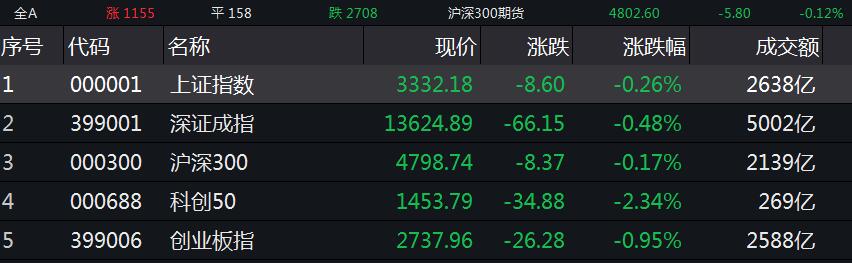 截至收盤(pán),滬指報(bào)3332.18點(diǎn),跌幅0.26%,成交額2638.49億元;深成指報(bào)13624.89點(diǎn),跌幅0.48%,成交額5001.58億元;創(chuàng)業(yè)板指報(bào)2737.96點(diǎn),跌幅0.95%;上證50指數(shù)報(bào)3371.40點(diǎn),漲幅0.06%。