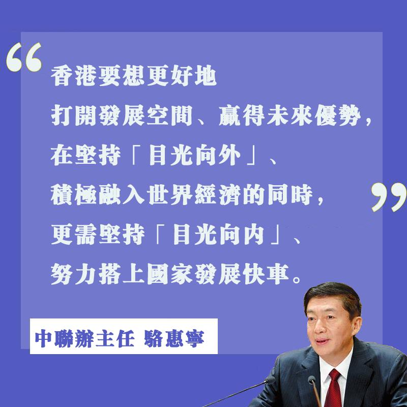 駱惠寧最後表示,完全贊同林鄭月娥行政長官提出的,「香港未來的經(jīng)濟發(fā)展,應(yīng)該更把握融入國家發(fā)展大局,把握國家發(fā)展帶給我們的可以改革的機遇」。他強調(diào),中聯(lián)辦將全力支持特區(qū)政府依法施政、改革創(chuàng)新,促進香港更好融入國家發(fā)展大局,推動香港實現(xiàn)新的發(fā)展。