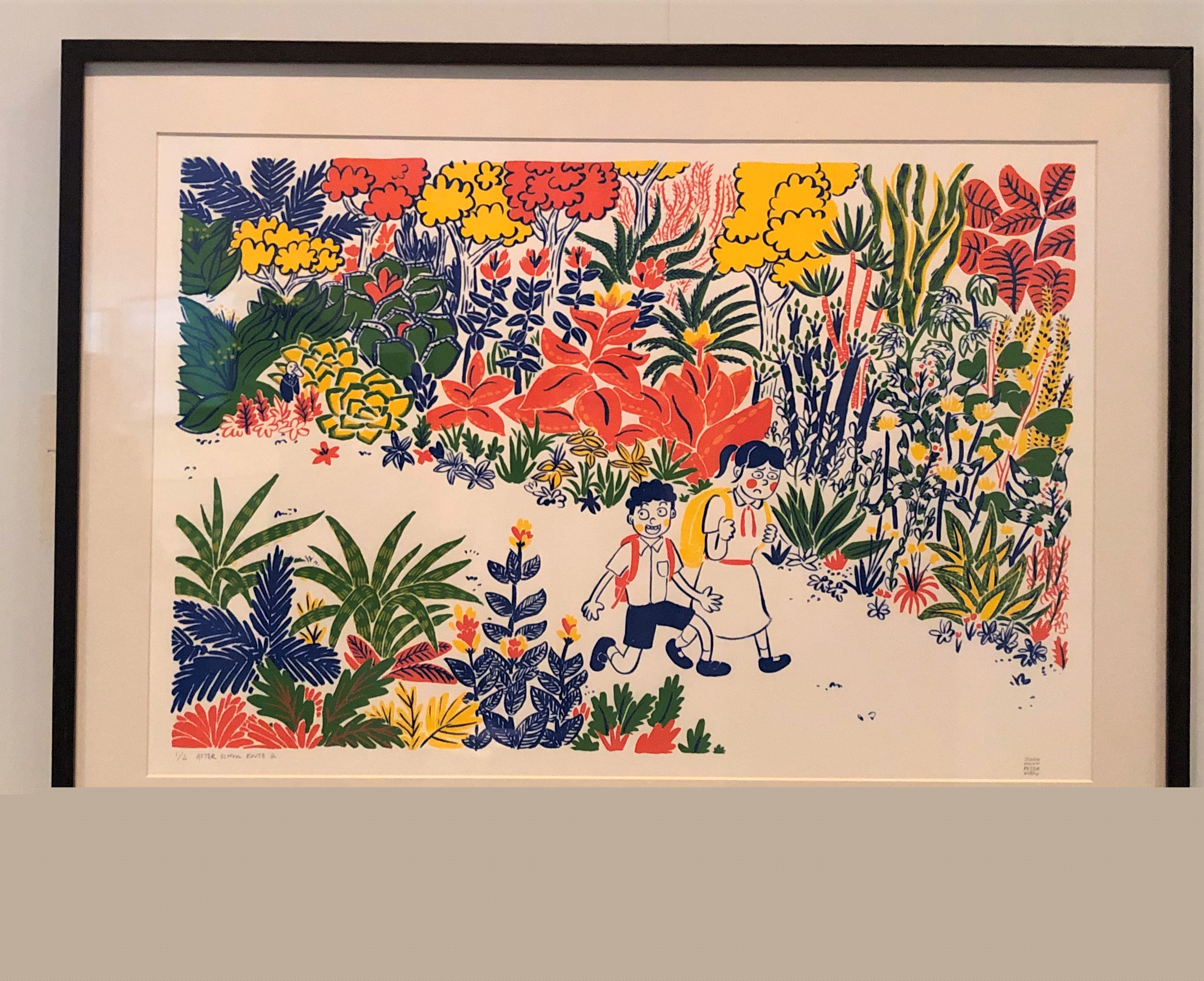 藝術(shù)家有時會只創(chuàng)作一個版本的版畫,被稱為「獨幅版畫」。是次展覽中也有不少「獨幅版畫」,如Onion Peterman的《Poster Poster》描繪貼街招的場景,藝術(shù)家逐張街招以絲網(wǎng)印刷,拼成色彩繽紛的街頭景象,也因為色彩繁多,製作的步驟相當(dāng)複雜,作品難以再複製多一幅,便成為獨一無二的16色版畫。直至今日,仍有不少本地藝術(shù)家鍾情版畫創(chuàng)作,可能就是因其製作繁複,以及未到最後一刻也不知道作品成果的刺激吧。