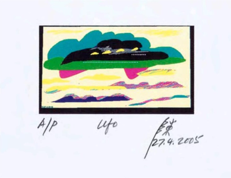 版畫與水墨畫、油畫、水彩畫都是繪畫形式的一種,不過版畫的獨特之處在於能夠複製,通過印刷可以製作出多幅作品。其實,版畫有限定版數(shù),每幅亦有藝術(shù)家的親筆簽名,當(dāng)印製指定數(shù)量後,藝術(shù)家不會加印,甚至銷毀印版,以維護作品的價值,觀者可從畫作下方的分數(shù)了解該作品的資料。通常在畫的左下標(biāo)明印製的數(shù)量與張數(shù),中間是作品名稱,右下則是藝術(shù)家簽名。展品《陳餘生八十——UFO》的左下卻標(biāo)明A/P,表示該作品為藝術(shù)家的自存版,也指藝術(shù)家保留的版畫試印作品。向來創(chuàng)作塑膠彩的本地繪畫大師陳餘生於十多年前因健康原因,轉(zhuǎn)而用電腦程式「小畫家」製作數(shù)碼版畫,其展品一般色調(diào)亮麗,畫面充滿童趣。在電腦上要用許多工夫放大處理色塊之間的邊線問題,還要跟進顏色的調(diào)校,該展品有機會是藝術(shù)家在最初試驗製作的版本。