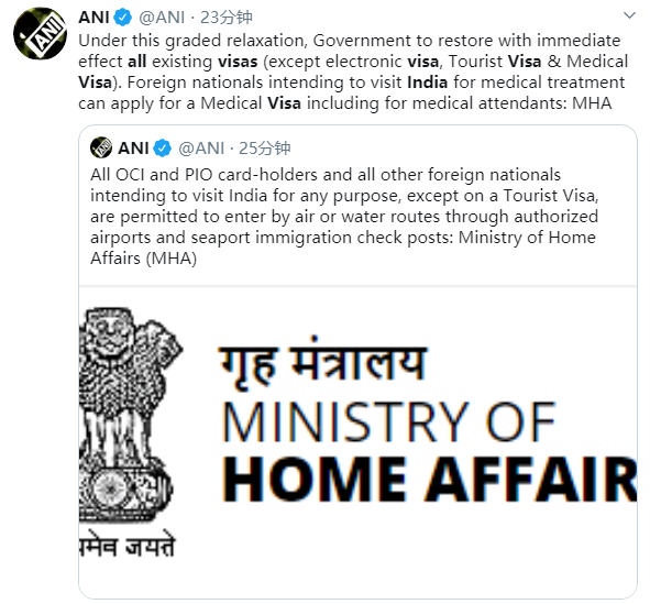 消息稱,持有印度裔卡(PIO)和印度海外公民證(OCI)的人,以及其他以任何目的赴印度的外國公民(持旅遊簽證除外),都可以通過已授權(quán)的機(jī)場(chǎng)或港口入境。根據(jù)此前報(bào)道,為應(yīng)對(duì)新冠肺炎疫情的擴(kuò)散,印度曾在3月宣布暫停所有簽證。
