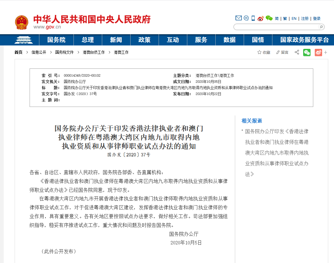 10月22日,國(guó)務(wù)院辦公廳公布印發(fā)《香港法律執(zhí)業(yè)者和澳門(mén)執(zhí)業(yè)律師在粵港澳大灣區(qū)內(nèi)地九市取得內(nèi)地執(zhí)業(yè)資質(zhì)和從事律師職業(yè)試點(diǎn)辦法》(以下簡(jiǎn)稱(chēng)《辦法》),對(duì)試點(diǎn)工作涉及的報(bào)名、考試、申請(qǐng)執(zhí)業(yè)、業(yè)務(wù)範(fàn)圍、執(zhí)業(yè)管理和組織實(shí)施等作出規(guī)定。