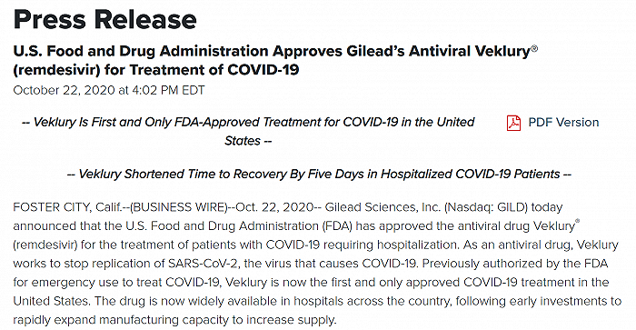 當(dāng)?shù)貢r(shí)間周四盤後,吉利德科學(xué)發(fā)布公告稱,美國(guó)食藥監(jiān)局已經(jīng)批準(zhǔn)瑞德西韋作為新冠住院患者治療藥。這也使得該藥物成為全美第一個(gè),且為唯一一個(gè)獲得FDA批準(zhǔn)的新冠治療藥物。