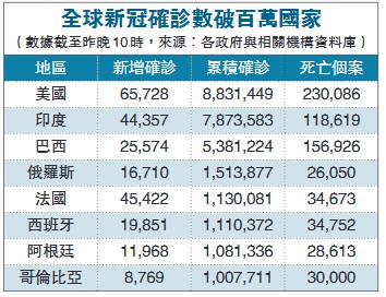 世衛(wèi)數(shù)據(jù)顯示,全球新冠肺炎確診病例上周六數(shù)字較前一日增加465322例,再創(chuàng)疫情爆發(fā)以來單日最大增幅,而歐洲地區(qū)當日報告新增確診病例逾22.1萬宗,為世衛(wèi)對全球劃分的6個地區(qū)中數(shù)量最多。歐洲疫情近期迅猛反彈是全球日增確診病例數(shù)字屢創(chuàng)新高的重要原因。截至昨晚9時,全球新增新冠確診病累計確診逾4311萬宗,累計逾115.6萬人不治。