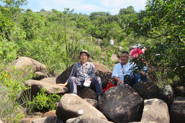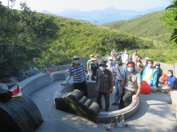 到下午1時,20多名五福堂子孫(3歲至82歲)分別驅(qū)車到龍蝦灣路,停在大坑口附近一處山徑入口。這條山徑可通到坐落大山(土名)的十二世劉其質(zhì)及其夫人曾氏的墓地,但沿途崎嶇不平,有很多大小石頭,逾半路段更要走在大石澗,有些石頭有半個成人身高,要手腳並用攀上。當(dāng)走至高處,可眺望相思灣一帶,風(fēng)光優(yōu)美。大家走走歇歇,差不多用了1小時才到墓地。部分人即第五房振兆後人先轉(zhuǎn)到另一山頭,拜祭振兆夫人鄭氏。
