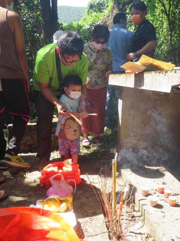 今年祭祖吉日為10月18日星期日,由早上近10時至下午4時半,各房子孫浩浩蕩蕩地去拜祭開基祖清十一世劉子玠、十二世劉其質(zhì)及其夫人曾氏。劉子玠墓地在檳榔灣東心壠,東心壠為土名,現(xiàn)今人只稱它為五塊田。由於土地有所發(fā)展及交通改善,私家車可開到墓地入口小路。記者隨村民抵達(dá)入口,然而極目所望也找不到墓地。上洋村居民代表劉啟康說,經(jīng)一年時光,墓地已被藤蔓及雜草遮蔽了,所以大家?guī)溏牭丁甙?,?zhǔn)備清理。他又表示,不少村落會在拜祭前找人預(yù)先清理,他們從前也是這樣,但近幾年變?yōu)榈綀銮宄?,希望族人致祭時更投入。在十多名村民努力下,大約用了50分鐘,墓地周邊豁然開朗,無遮無擋,還見到一棵果實(shí)纍纍的木瓜樹。
