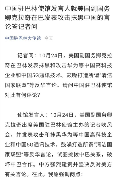 發(fā)言人應(yīng)詢表示,10月24日,美國(guó)副國(guó)務(wù)卿克拉奇出席美國(guó)駐巴林使館主辦的記者吹風(fēng)會(huì),並發(fā)表攻擊和抹黑華為等中國(guó)高科技企業(yè)和中國(guó)5G通訊技術(shù),鼓譟打造所謂「清潔國(guó)家聯(lián)盟」等反華言論,試圖挑撥中巴關(guān)係,破壞中巴合作。中方強(qiáng)烈譴責(zé)並堅(jiān)決反對(duì)美方有關(guān)言論。在此,我願(yuàn)強(qiáng)調(diào)兩點(diǎn):