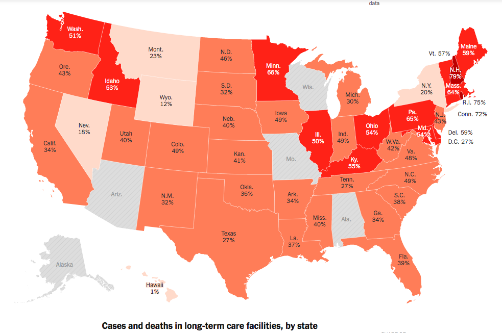 9月初,《紐約時(shí)報(bào)》發(fā)表題為「68000例死亡人數(shù)中有多少本可以避免」的文章稱,這麼多人在養(yǎng)老院中因?yàn)楦腥拘鹿诓《径劳鍪恰笡]有道理的」。一個(gè)多月後,數(shù)字攀升到了84000例,佔(zhàn)美國死亡總數(shù)的38%。