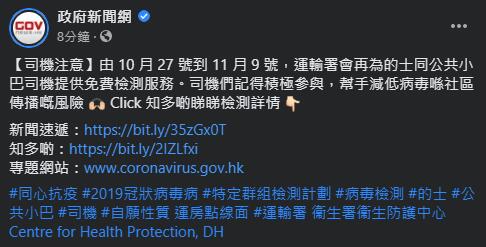 政府新聞處於社交平臺表示,運輸署會由明日(27日)起再為的士及公共小巴司機提供免費新冠肺炎檢測服務(wù),呼籲司機們積極參加,幫忙減低新冠肺炎在社區(qū)傳播的風(fēng)險。政府新聞網(wǎng)亦向的士及公共小巴司機提供網(wǎng)頁,讓他們可了解檢測服務(wù)的詳情。