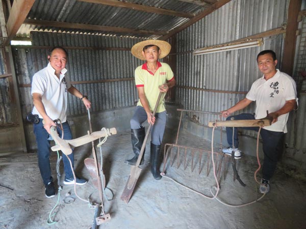 福利會成員(左起:陳耀安、列安邦、廖志協(xié))致力保育村落,他們手中的昔日農耕用具(左起:犂、鍬、耙)會成為故事館的展品。記者 鄭玉君攝