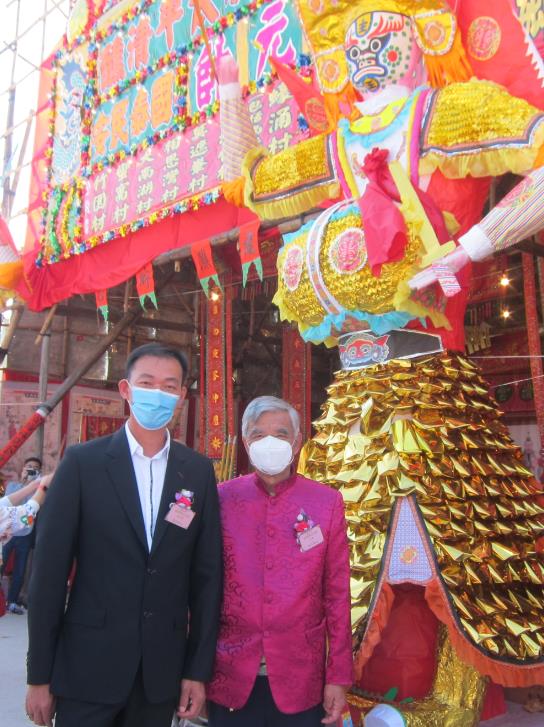 蠔涌聯(lián)鄉(xiāng)太平清醮籌備委員會(huì)主席張土勝(右)及副主席溫世邦在醮場(chǎng)恭候嘉賓及獅隊(duì)到賀。特約記者 梁美儀攝