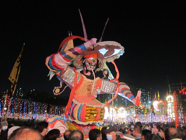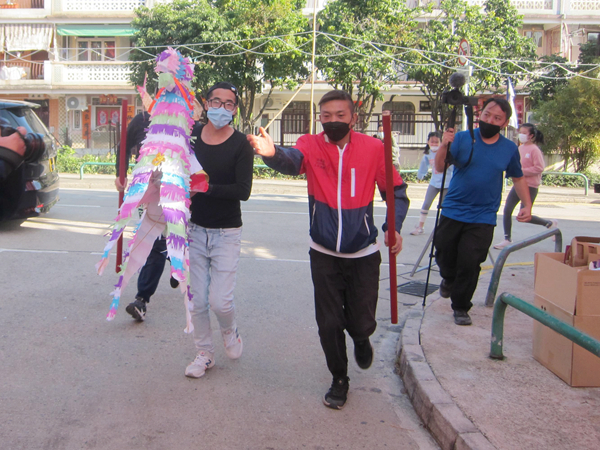 同日晚上大士人巡圍掀醮會(huì)高潮,村民爭(zhēng)相拍照,但中途大士人腰背「不適」,經(jīng)修理後堅(jiān)持完成巡圍,如彭宏健說(shuō)「面對(duì)前方未知的困難,也能輕鬆?wèi)?yīng)對(duì)」?;氐锦磮?chǎng),大家排長(zhǎng)隊(duì)「捐」過(guò)被抬高的大士人胯下,希望新一年身體健康,疫情消失。(香港商報(bào)特約記者 梁美儀)