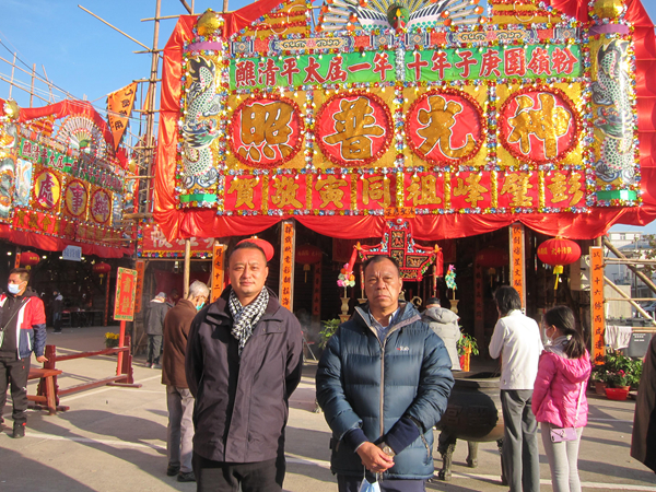 粉嶺圍醮務(wù)委員會(huì)主席彭慶培(右)和副主席彭宏健表示,醮會(huì)在疫情下能順利進(jìn)行,有賴村民熱心參與,分工合作。特約記者梁美儀攝