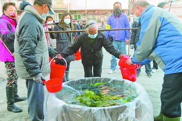 醮會第一日(13日)啟壇前有「取水」儀式,即到村旁古井取水貯於大缸中,經符籙去污、密封後置於醮壇,直至醮會結束再分給鄉(xiāng)民。但聽80歲父老張旭泰說,二三十年前古井受污染,於是轉用水喉水。「取水」儀式在早上8時舉行,過後有後續(xù),就是村民同樣會取水,這一大缸村民專享水喉水放滿碌柚葉用作潔淨,大批村民肩上有擔挑,擔下繫著兩個紅色膠桶,井然有序地逐個取水,這種擔挑水桶陣,有一點點歷史感覺,讓人想起60年代的制水情景。張旭泰說,很小的時候就在醮會拿取神水,盛載器皿一向是紅色水桶,水拿回家用來煲茶、煮飯,可保你家庭幸福,長命百歲。
