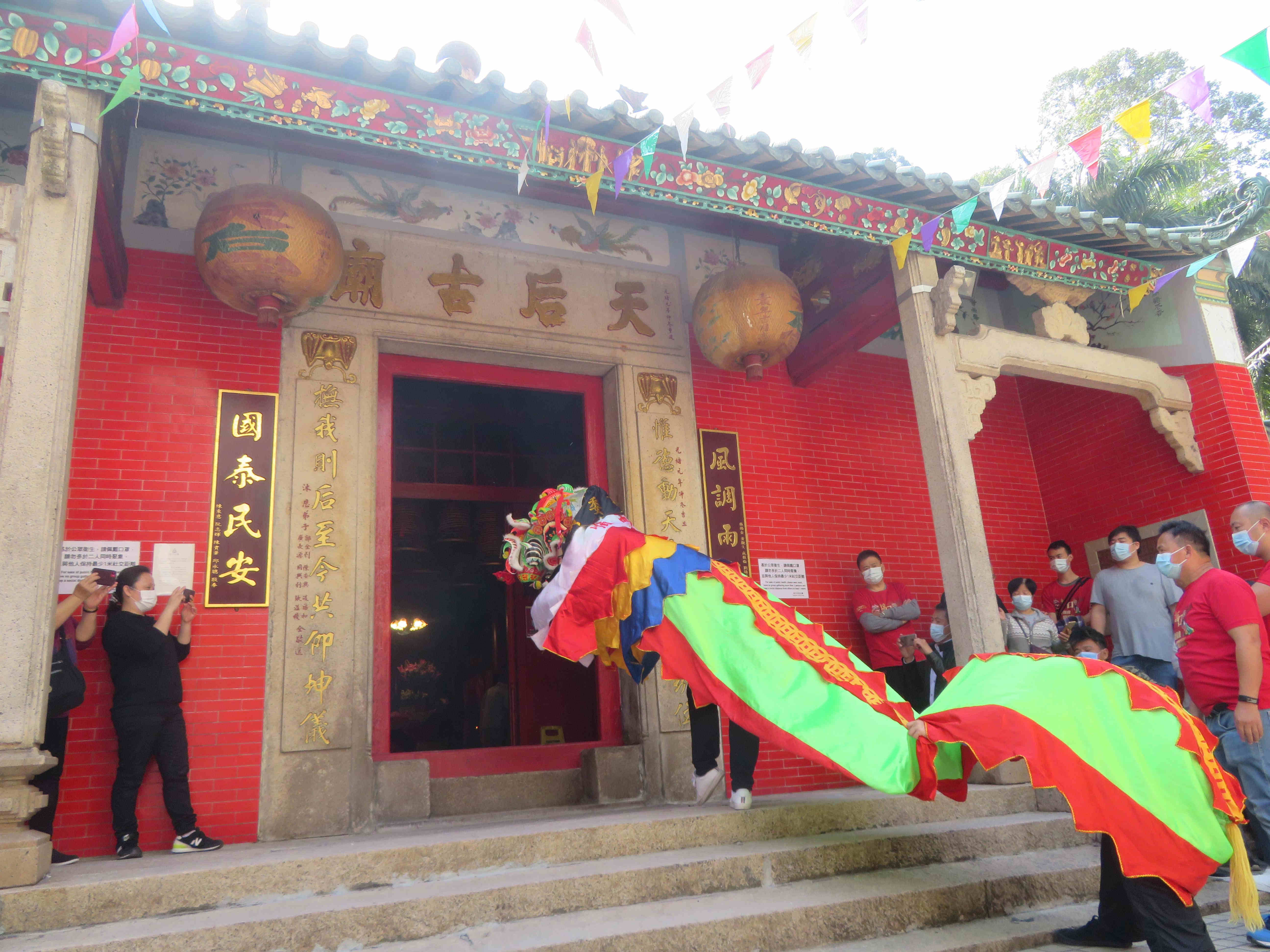 上午10時(shí)半,兩隻麒麟在鑼、鼓、鈸引奏下,先後進(jìn)入坑口天后古廟參拜,其後採(cǎi)青。到11時(shí),劉啟康率領(lǐng)鄉(xiāng)委會(huì)成員入廟上香拜神,向天后三鞠躬,祈求天后庇佑,在辛丑年風(fēng)調(diào)雨順、國(guó)泰民安?;顒?dòng)進(jìn)行期間,亦向參與者宣傳防疫信息,派發(fā)口罩及搓手液。