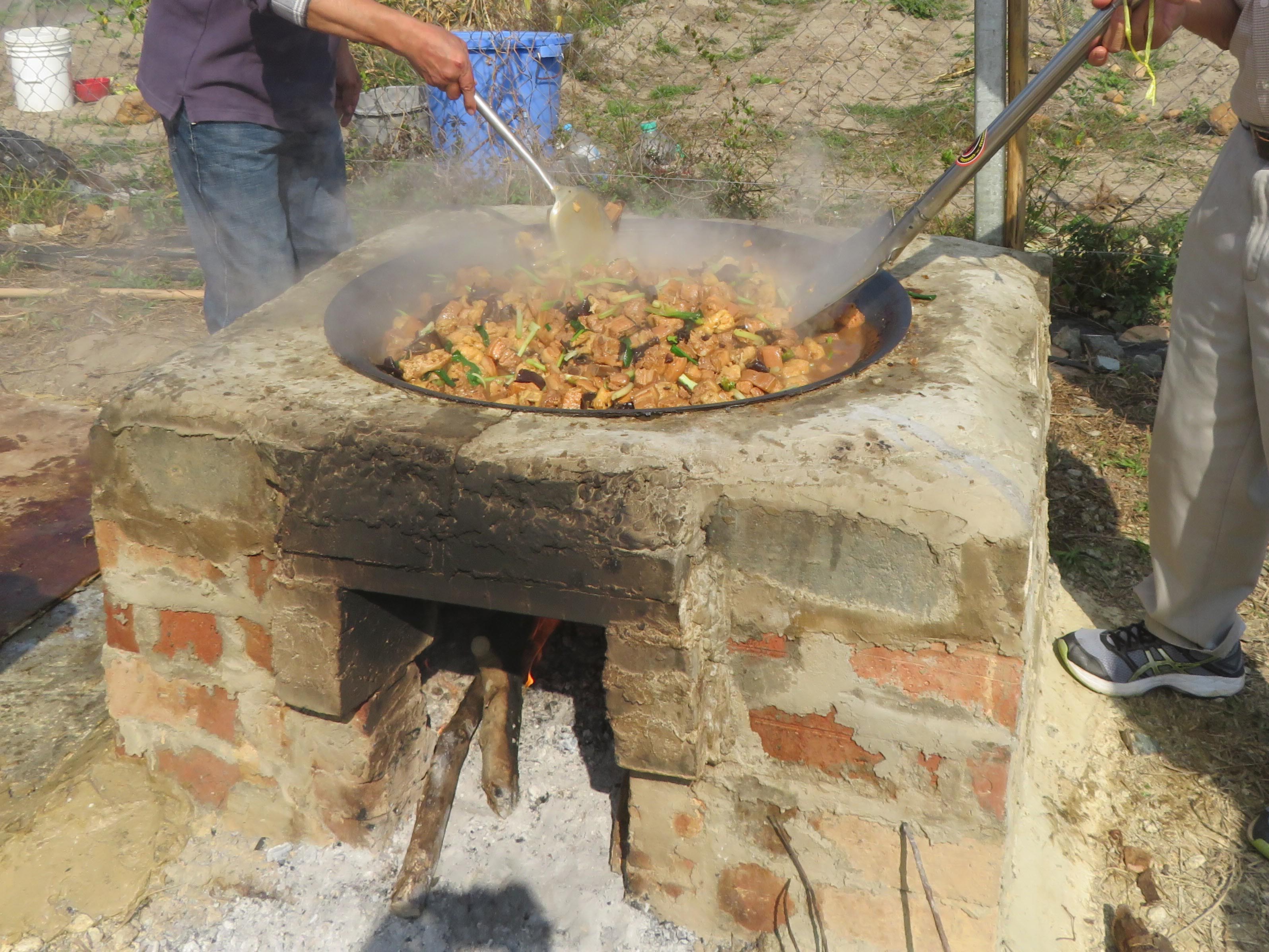 這條客家村幾近荒廢,近年一些村民致力復(fù)村,想找回「村落的味道」,試過(guò)炆豬肉兩次,但分量不多,只是十來(lái)斤。而辛丑年這一趟大陣仗得多,豬肉多達(dá)50斤。炆好的豬肉,除村民享用,亦拿到祠堂酬神。主廚是村民明哥,前兩次也有份參與,今次就成為掌舵人。有謂工欲善其事,必先利其器,有精於工程的村民特別造了一個(gè)可放大鑊的爐灶,打地臺(tái)砌了三層磚,以黃泥隔熱,旁邊還有煙囪。此外,購(gòu)置大鑊及鑊蓋,預(yù)先撿拾大堆枯木作燃料,其中有樟木。
