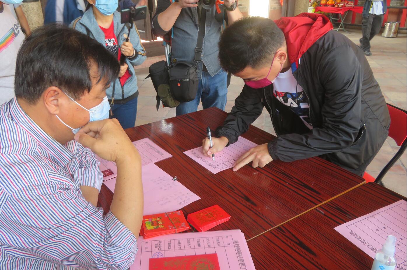 不久,陸續(xù)有村民帶同祭品來到祠堂向祖先參拜。負(fù)責(zé)點(diǎn)燈事宜的都是鄉(xiāng)中人員,其中一名工作人員為財(cái)哥,參與點(diǎn)燈事宜多年,他說祭品基本有3樣:紅丸、煎堆及生果。紅丸者實(shí)為湯丸,開燈用片形(圓燈用圓形),由於以往有村民會(huì)忘記帶紅丸,所以早早煮好一鍋備用。果然有新丁家人忘記,即時(shí)奉出令祭祖事圓滿。而新丁家人帶來的燈盞,其實(shí)是兩個(gè)疊住的油碟,仔細(xì)看,在底部油碟寫有新丁名字的小紙張、一塊柚葉,在上面的油碟放有兩條燈芯、兩個(gè)銅錢、一些白米和綠豆,但看供桌擺放的燈盞,並不是每個(gè)燈盞都有白米和綠豆。燈盞由工作人員或新丁家人親自放上供桌所屬鄉(xiāng)村位置並添油點(diǎn)亮。之後打鑼通天並燃燒炮仗,隨即登記新丁資料。
