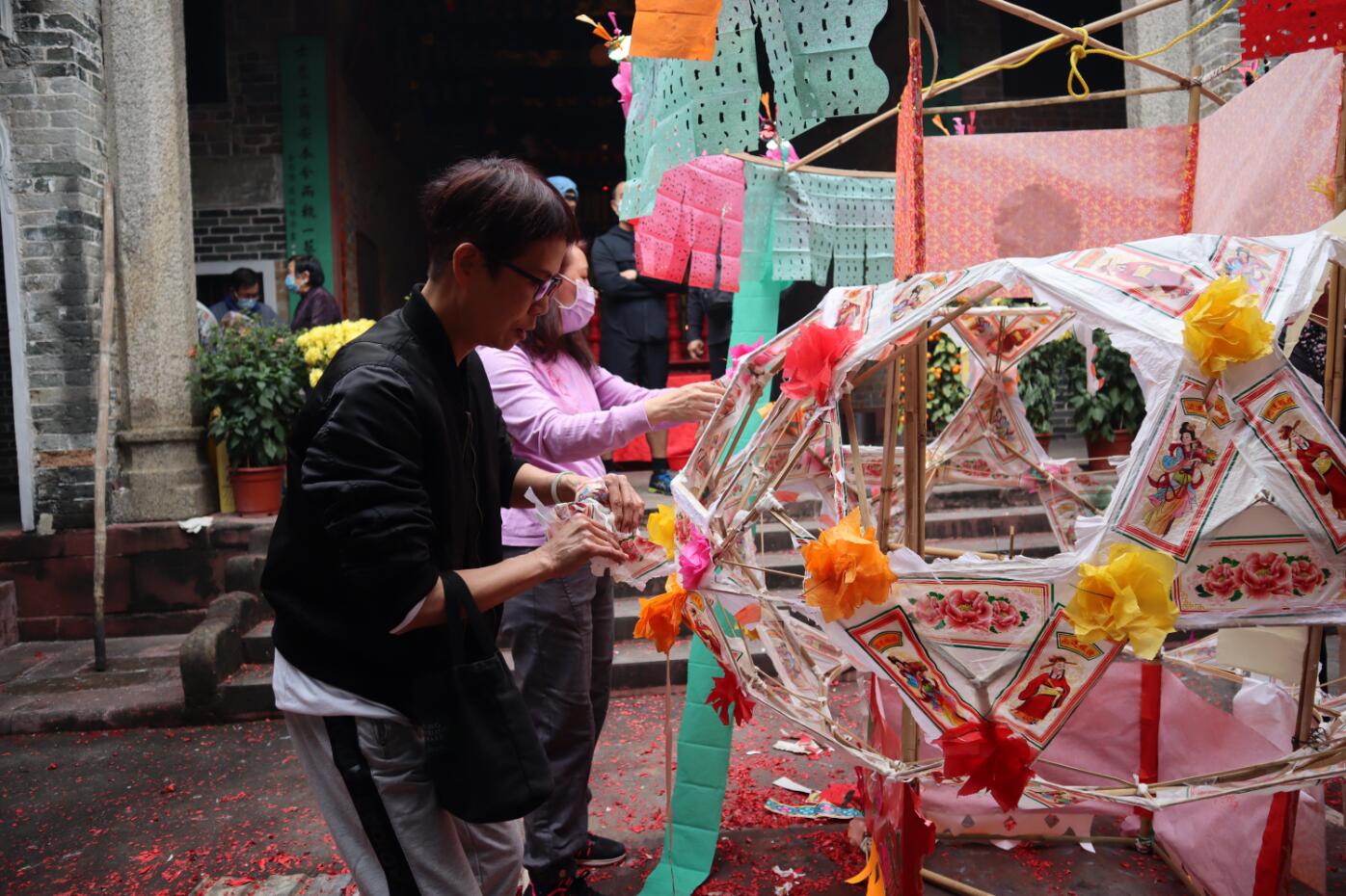 「無論世界如何變化,我們的傳統(tǒng)不會(huì)?!梗陆缫恍┐迓湓谝咔橛绊懴?,依舊在元宵節(jié)前後舉行點(diǎn)燈儀式,向祖先稟告族中有新成員誕生。燈,諧音為丁,「點(diǎn)燈」有添丁和繼後的意思,記者在正月十二及十五元宵節(jié),來到鄧族聚居地元朗廈村鄉(xiāng)的鄧氏宗祠,看看鄉(xiāng)中的集體點(diǎn)燈儀式,今年登記新生男丁共有13名,其中3名可掛燈的新丁全來自新生村,當(dāng)燈在祠堂掛起時(shí),一室華彩,祈願(yuàn)佳兆降臨。