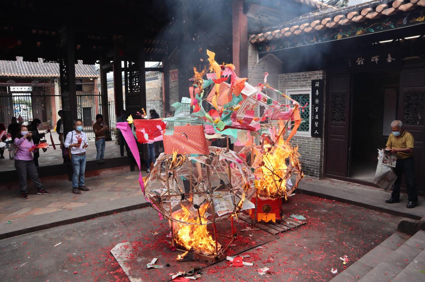 正月十五元宵日,圓燈儀式較簡單。新丁家人拜神後,將燈盞放入紅桶內(nèi),更為傳統(tǒng)的,會(huì)放入鋪有紅紙的米斗內(nèi),然後拿回家供奉。到11時(shí)45分,舉行化燈儀式,工作人員將花燈陸續(xù)取下放在中間天井位置,這時(shí)每個(gè)新丁家人都熱烈地將燈上的紙片撕下,這些紙片不少附有吉祥圖案如麻姑進(jìn)酒、丁財(cái)貴壽、五福臨門、添丁發(fā)財(cái)、加官晉爵等。當(dāng)大家拿得七七八八,工作人員即將花燈化掉,之後亦是燃放爆竹及分燒豬肉,整個(gè)點(diǎn)燈儀式至此圓滿結(jié)束。