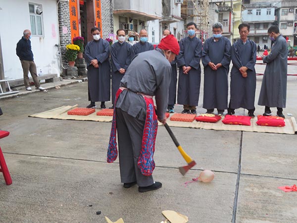 記者見神壇前貼有兩副對聯(lián),正月十五前貼的對聯(lián)為 「曆序新春人傑慶燈逢此日,儺行古禮神靈逐疫應其時」,下聯(lián)中提到 「逐疫」,對抗疫一年多的港人甚有共鳴, 「儺」(粵音挪)是古時迎神驅疫癘的一種風俗,結合上聯(lián) 「新春」、 「慶燈」,全聯(lián)大約意思:適逢新春開燈日,請神明來村中逐疫保佑人畜平安。正月十五當子時一到,便在原有的對聯(lián)位置貼上另一對聯(lián) 「昔年告許洪朝願,今日酬恩答謝神」,開始兩日酬恩的大型朝拜,連串儀式都與祈求子孫昌盛和驅疫除穢有關。