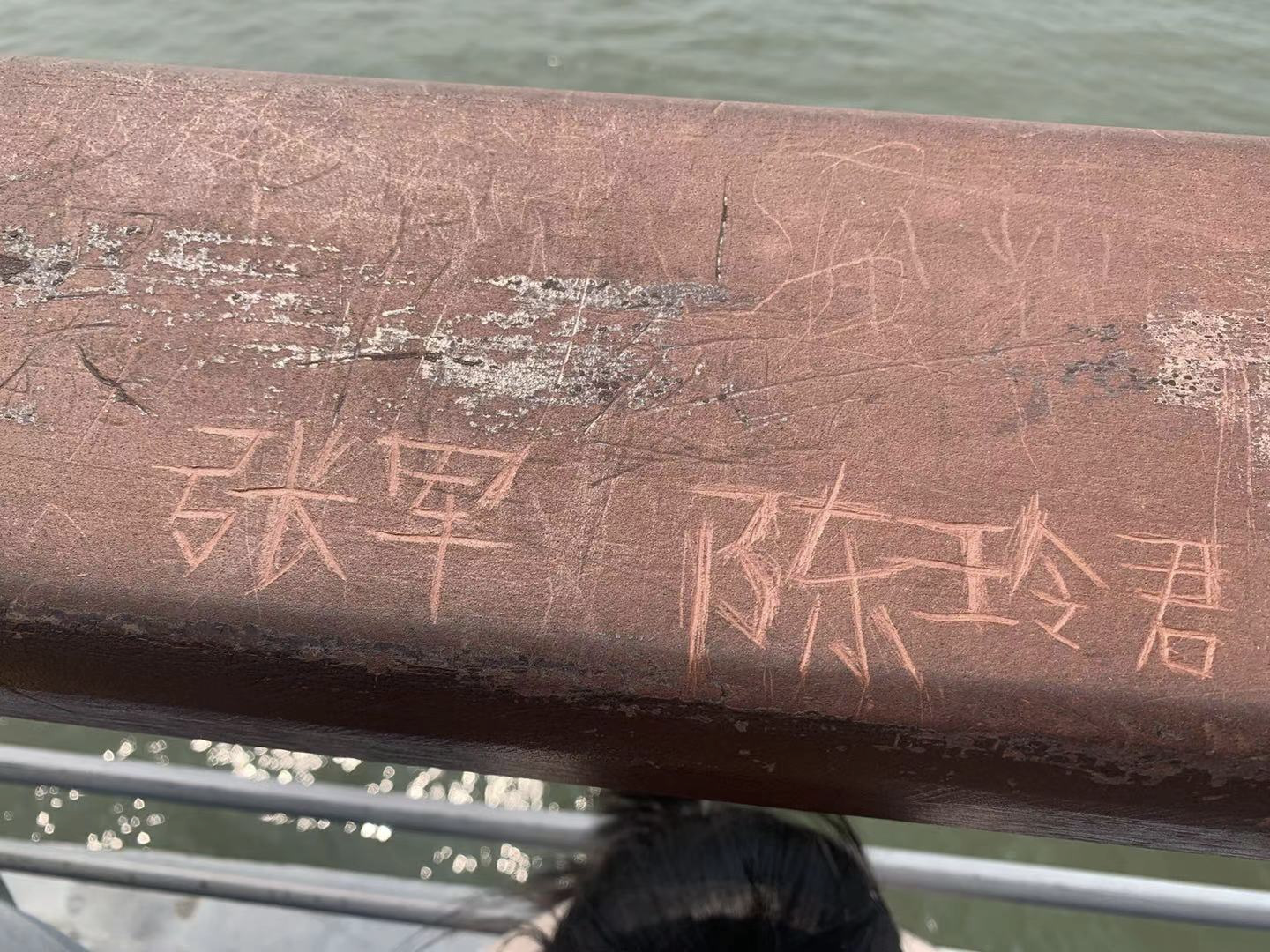 不過在廊橋上,廊橋護欄不少地方存在刻畫的痕跡?!钢活娨恍娜宋ㄒ坏膼蹅堋埂竸⒅菑娂佑汀埂副?傄挥巍埂赴撞藧圬i」等等類似的表白留言、名字刻劃不少,其中橋廊沿海最外端,不足50米長護欄,竟然刻畫了三四百條留言之多。