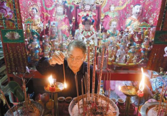 喃嘸先生在禮斗祈福法會開始前,先在蝦姑壇前上香。圖最後方正中為蝦姑塑像。周樹佳提供圖片