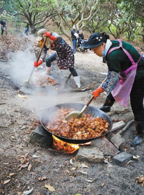 即場烹煮柴火炆豬肉,熱氣騰騰,肉香四溢。記者 鄭玉君攝