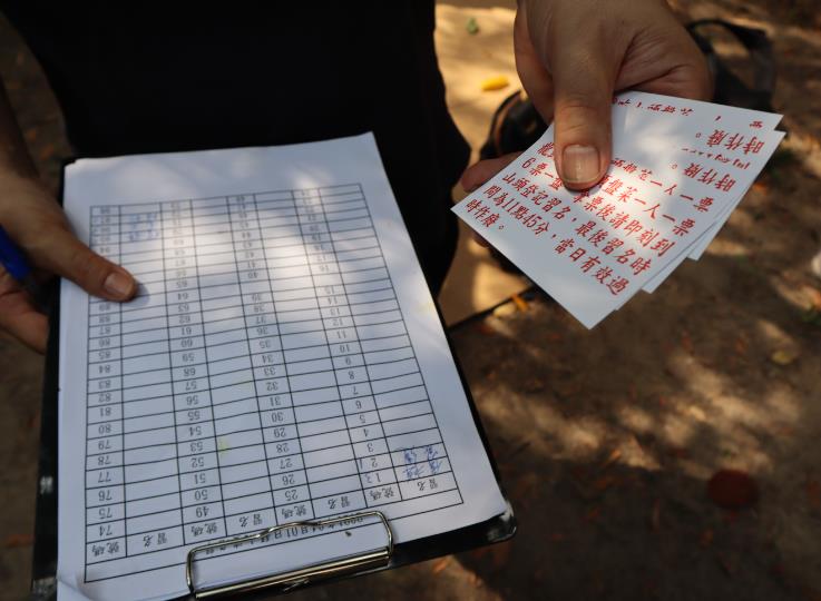 依祭祖程序,到龍鼓灘「食山頭」的族人來到後需要先拿票,之後登記名字,每人一票,6票一盆,截止時間為11時45分,之後「打盆」,負(fù)責(zé)祭祖事宜的祭主經(jīng)點(diǎn)算後,需要打62盆。事實上,因限聚令緣故,不少人都是湊夠4票就拿一盆,撇除給予提供場地的園主及相關(guān)出力人士的6盆,以4人一盆計算,出席食山頭的族人及其友人,有200多人。