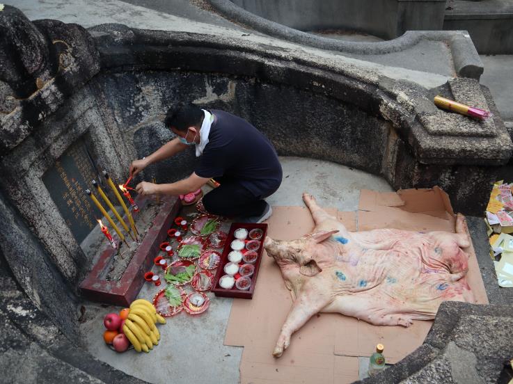 到8時,祭主開始拜祭十八世祖鄧若虛,這時墓前已預(yù)備好祭品,包括一頭原隻生豬、5杯茶、5杯酒、5副生及熟豬內(nèi)臟、5碗飯、5碗紅棗、糕點(diǎn)及生果。拜祭過後的生豬就拿去斬件待煮。