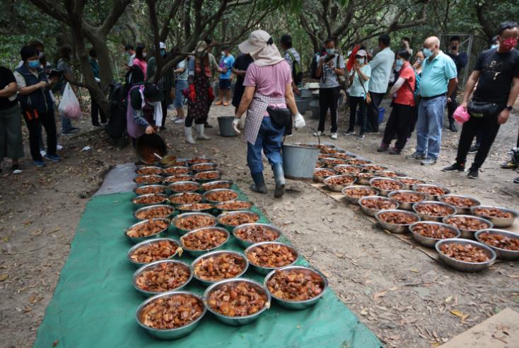 疫情放緩,市民心情放鬆,出行增多。屏山鄧族到龍鼓灘祭祖「食山頭」也創(chuàng)出近20年紀(jì)錄,即場烹製的柴火炆豬肉加配菜,共裝了62盆,反映到場「食山頭」族人踴躍。負(fù)責(zé)煮山頭盆菜者估計,可能與疫情下圍村食盆菜較以往減少,在疫情稍斂下,大家興致高些。
