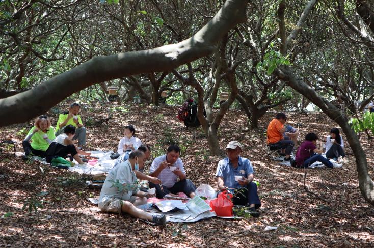 不忘遵守限聚令,荔枝林內(nèi)每4人席地圍食。
