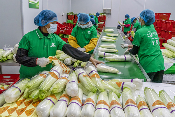 在粵港澳大灣區(qū)「菜籃子」基地,工人對供港澳蔬菜進(jìn)行包裝。