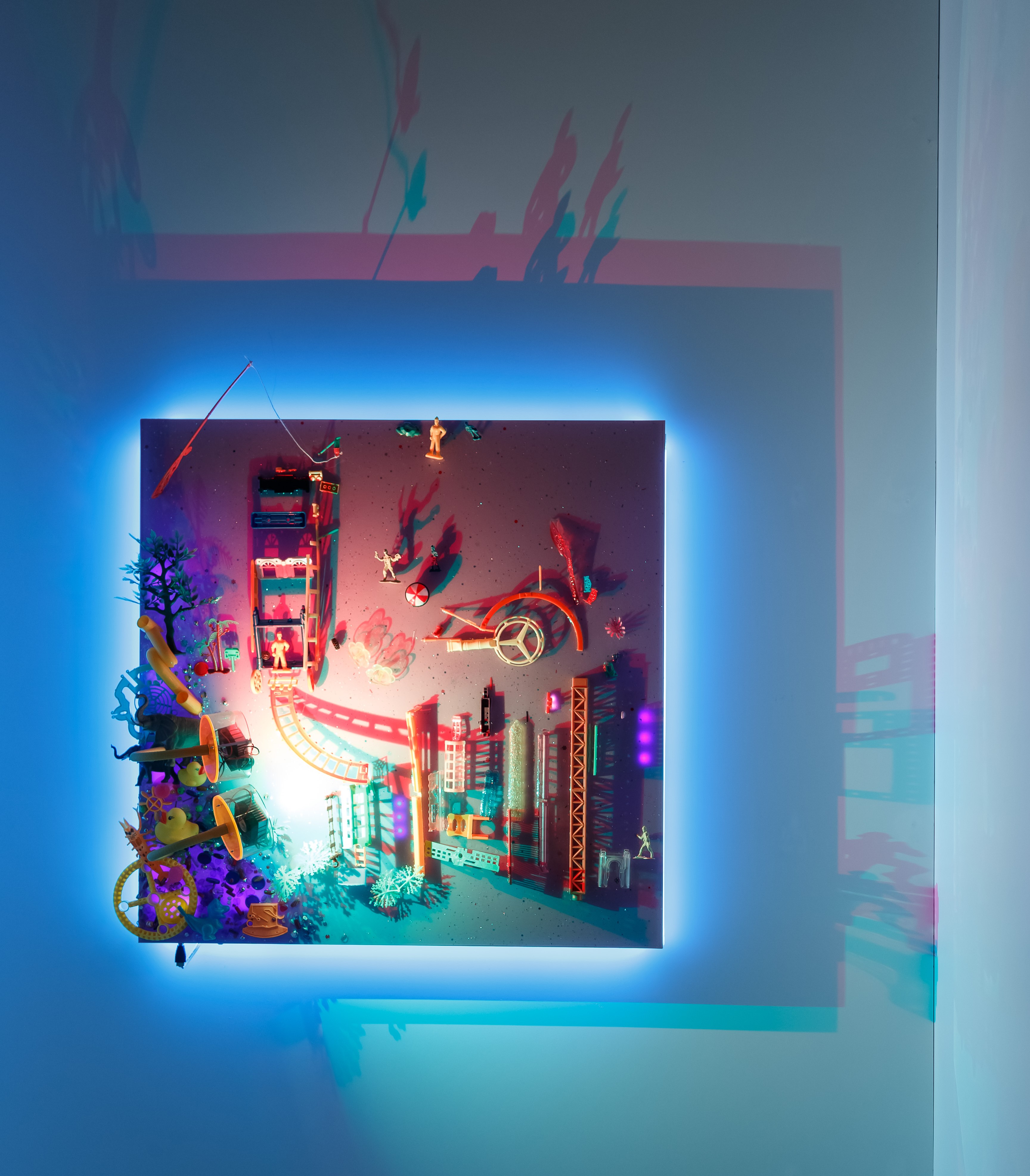阮家儀的「時光機蕩失路」作品運用各種各樣的老式塑膠玩具和物件,製作成雪糕車、街邊小販、電車、人力車等模型,結(jié)合光影把戲展現(xiàn)本地文化。