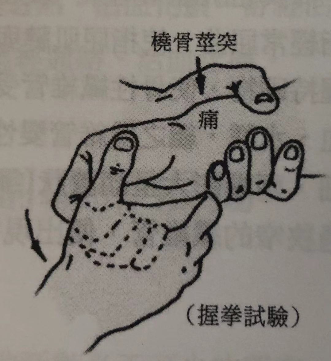 臨床主要癥狀有:自覺腕部橈側(cè)疼痛、提物無力、手腕橈側(cè)莖突部有輕度腫脹、該處壓痛明顯、嚴重時疼痛傳射至整個手部,夜間因痛難以入寐,手握水杯會因疼痛失力,摔落手中之杯。有時橈側(cè)腫痛處可摸到沙沙之聲,檢查,「握拳試驗陽性」。橈骨莖突部狹窄性腱鞘炎屬中醫(yī)的「傷筋」範圍。