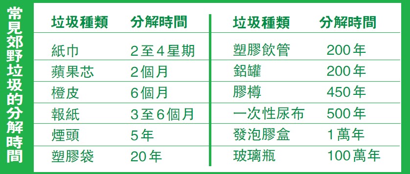 若郊野垃圾不能腐解,對環(huán)境的破壞會逐漸加劇,伍教授解釋:「有機(jī)物質(zhì)在自然界中會隨時(shí)間被生物降解,如草的降解時(shí)間約數(shù)月、樹葉約一年多,但很多垃圾都不能被分解,如塑膠廢物,它們的分解只是變成更小的碎片,如微塑膠,但卻不會完全消失?!刮⑺苣z泛指體積小於5平方毫米的塑膠微粒,一個(gè)膠樽被遺留在郊外,需要400年時(shí)間分解,之後會變成微塑膠繼續(xù)存在。鄭茹蕙補(bǔ)充:「微塑膠透過雨水衝入溪流,再流入大海,危害生態(tài),它含有毒化合物、體積細(xì)小,長期殘留在海洋容易被魚類誤食。由於塑膠粒難以被消化、分解,若遺留在土地上,植物也會由根部吸收,微塑膠在食物鏈中不斷累積,最終只會被人類攝取?!褂萌昼婏嬐暌恢z樽水,用1秒隨手扔掉,但卻需要人類幾百輩子的時(shí)間令它消失,甚至自己承受惡果,情況實(shí)在值得行山客反思。