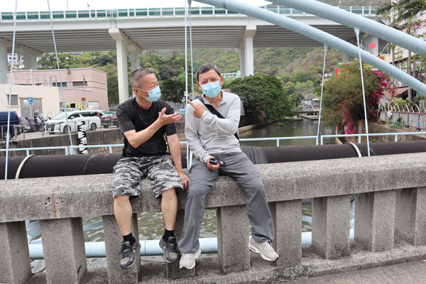 鄭裕光(左)與姚志明在水坑上的橋壆閒坐笑談紗廠女工,恍惚回到少年時(shí)。