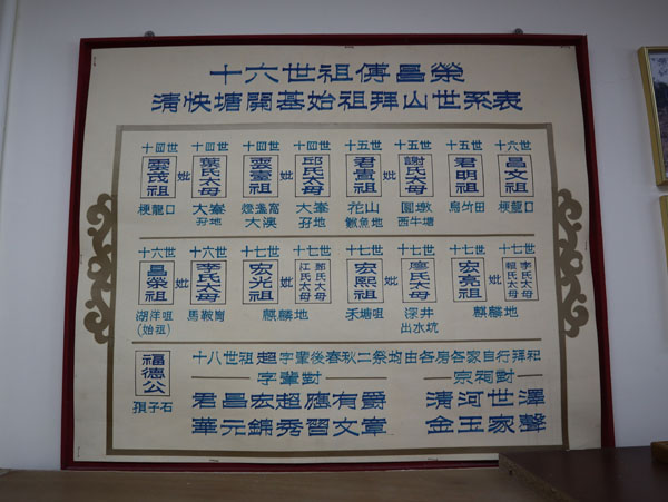 深井村公所內(nèi)陳列的傅族祭祖世系圖,顯示祖先來深井(清快塘)開基立業(yè)已有幾百年。