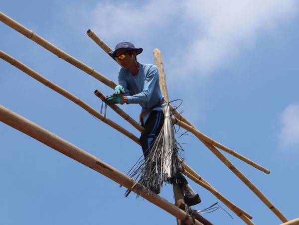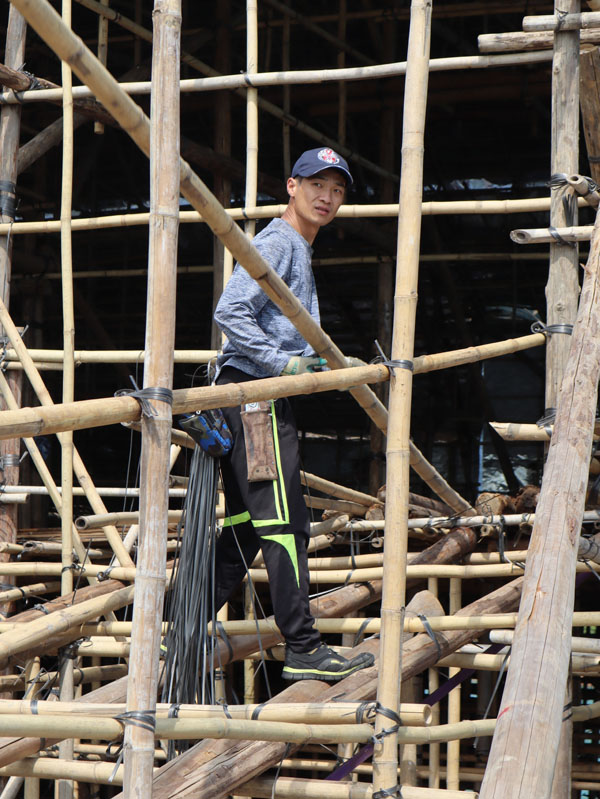 地面師傅傳遞竹枝給棚上師傅做擔(dān)通,默契十足。