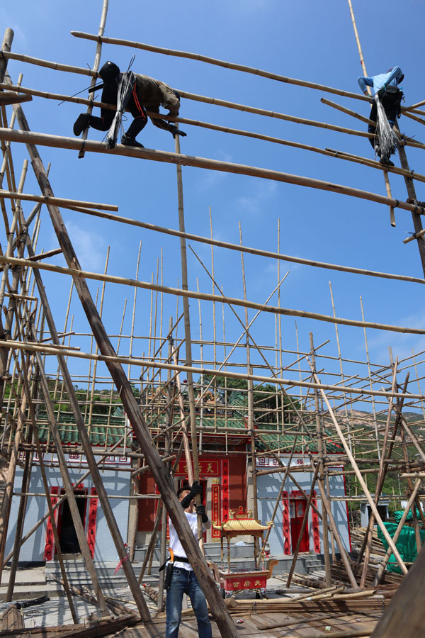 為理解搭戲棚是怎麼一回事,早前天後誕前後走訪蒲臺(tái)島及長(zhǎng)洲,看師傅們搭棚。看的天數(shù)只3天,每次只看2小時(shí),基本上難窺全豹,但粗淺知道這是一項(xiàng)非常重視團(tuán)隊(duì)合作的技藝。如搭棚頂即他們所稱的擔(dān)通,需要在地面的師傅傳遞不同長(zhǎng)度的竹枝給棚上師傅,紮在不同部位,又如豎立支柱作用的杉木,要合幾人之力。