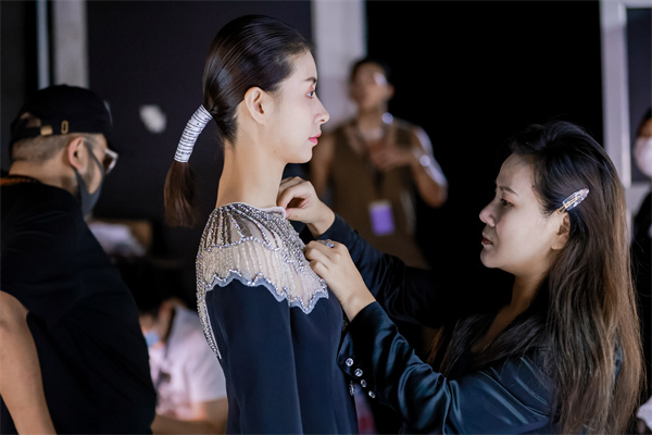 「設計師是個很有趣的工作,服裝是我的橋樑,是傳達我的價值觀和想法的橋樑。」方麗華說,「這次我也獲得了大灣區(qū)最佳文化創(chuàng)意獎,接下來我希望在中式美學包括旗袍、手工藝的發(fā)展上進行突破,讓更多人欣賞中式美學。」據方麗華介紹,刺繡只能在特定的面料上進行,在寬鬆的面料上比如香雲紗上刺繡就不夠時尚。因此她也聯合了面料商進行創(chuàng)新突破,在有彈性的香雲紗上進行剪裁。