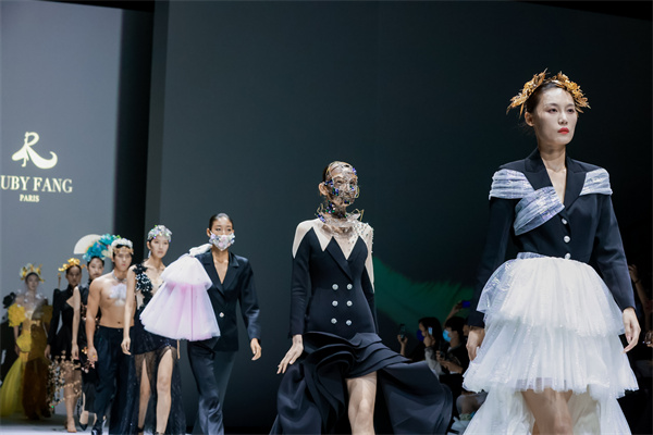 SS 2022深圳時裝周是RUBYFANG品牌工作室搬到深圳後的首次大秀。RUBYFANG在T臺華美呈現的是東方韻味與西洋風格系列主題設計成衣,傳統手藝和裝飾,頭頂上綻放的花束,與現代時尚融合、碰撞,開出一朵不一樣的花。方麗華說,此次主題是花園的概念,設計靈感來自福建泉州潯埔當地女性穿戴的髻花圍?!赴⒗说饺葆釣楸磉_友誼送給泉州人一朵花,如今泉州人仲保留住節(jié)日頭上戴花的傳統?!狗禁惾A說,「該主題有三個含義:一是推崇中國古老儀式,比如節(jié)日時戴花表達開心,二是友誼之花,中國與國外和睦友好發(fā)展的關係,三是疫情時代,朋友家人更應該互相鼓勵支持,送給彼此一些美好的東西。」